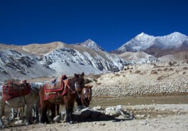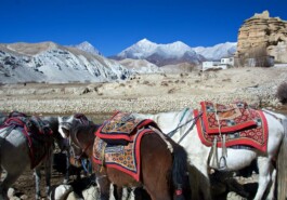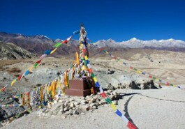 Unsere Abfahrt heute bringt uns einen guten Blick auf das Dorf Tetang, das aus zwei separaten Siedlungen besteht, die von hohen Mauern umgeben sind. Aus der Ferne ähnelt es einer großen Festung! Der Aufstieg zum nächsten Plateau ist steil und der Weg hier kann hart sein! Zum Glück ist unser nächster Weg ein leichter Spaziergang über eine Ebene. Wir müssen drei Stunden steil bergauf wandern und an dessen Spitze werden wir mit einem atemberaubenden Blick auf Thorung, Tilicho und Annapurna belohnt. Danach ist es ein einfacher Spaziergang zu Muktinath, der stark mit der lokalen Legende und der spirituellen Überlieferung verbunden ist.